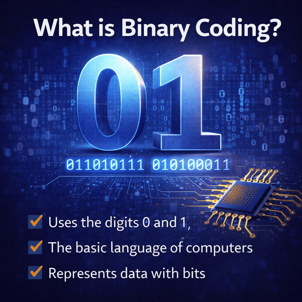 What is binary coding? Binary coding is a system of representing data using only two values: 0 and 1. These two values are known as binary digits, or bits. Every piece of digital information—text, images, audio, software—is ultimately translated into combinations of these bits.