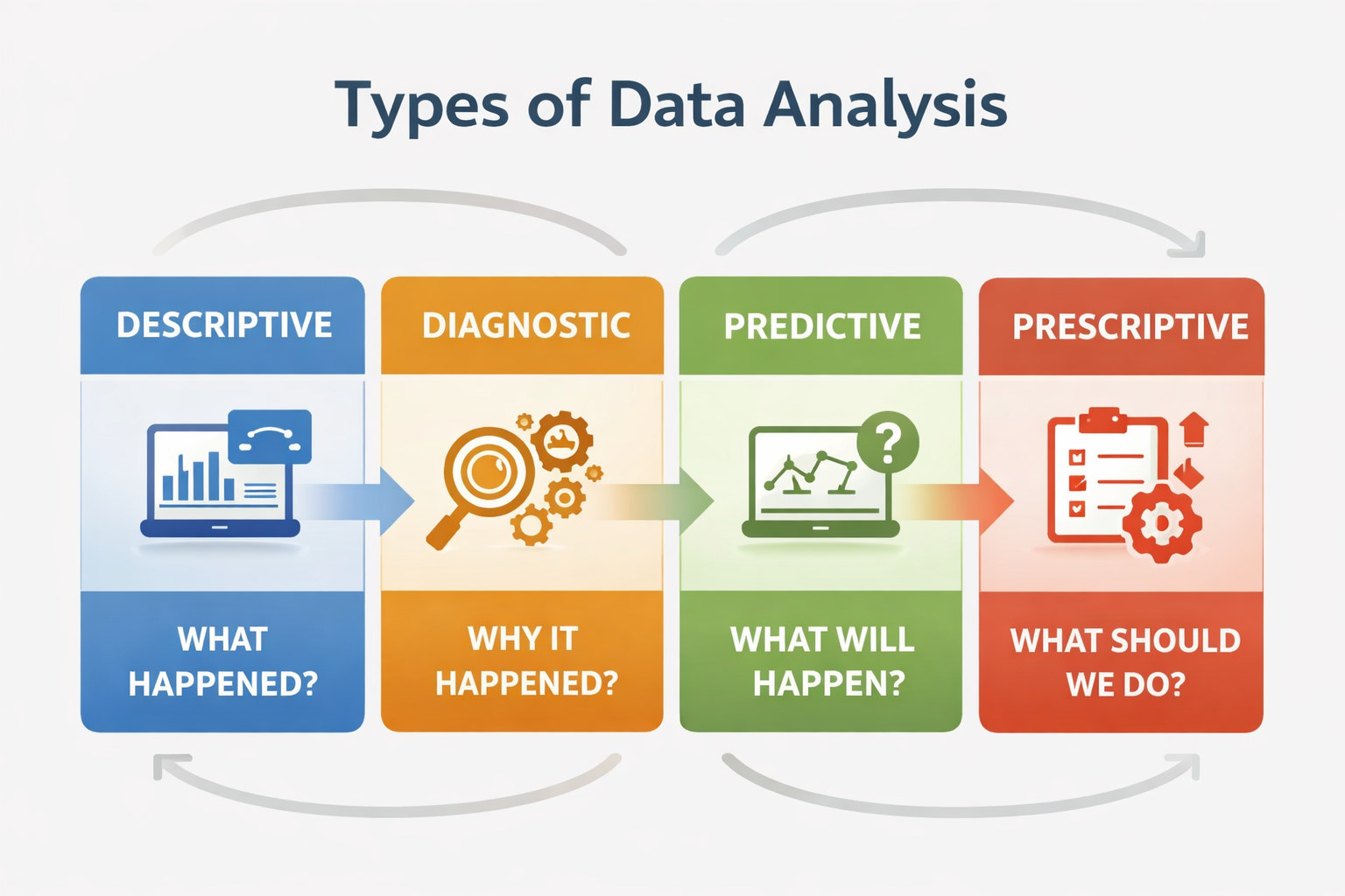 To fully understand what is data analysis definition, it’s important to explore its core types. Each type answers a different business question.