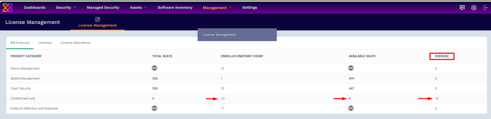 This section provides a snapshot of your current license utilization, helping you stay informed about how you’re leveraging your licenses. The ‘OVERUSE’ column is crucial to this overview. Any overuse indicated here means an additional invoice will be generated at the end of the month. Rest assured, Xcitium is committed to supporting your business expansion; we ensure continuous service without interruption. Remember, overuse translates to a post-paid scenario for the extra licenses utilized.